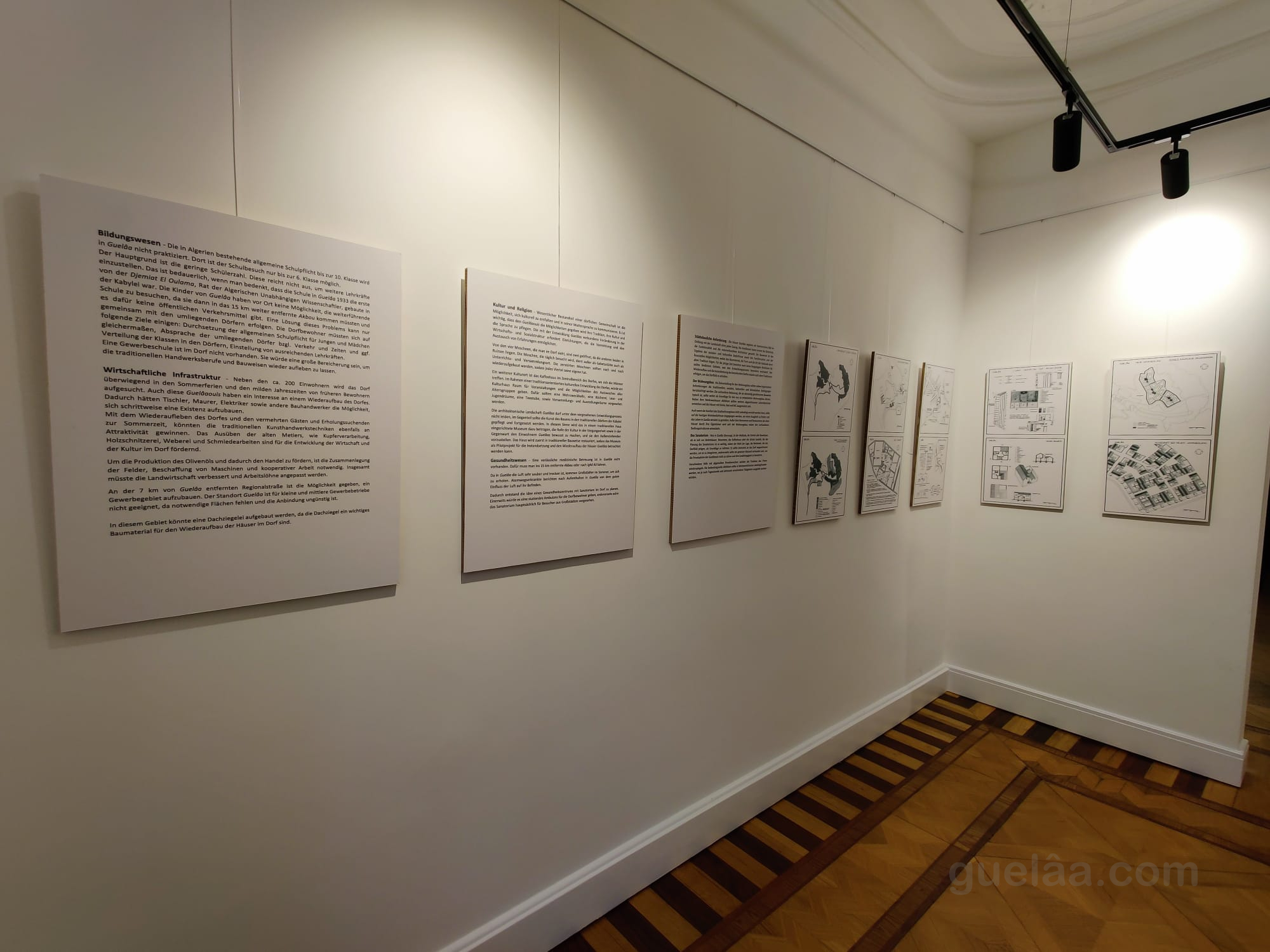 Dort können Sie die Arbeit des Architekten Mourad Mebarek über das Dorf seiner Vorfahren entdecken. Mit Plänen, Zeichnungen und Texten stellt sie die ökonomische, soziologische und geografische Gestaltung des Dorfes vor. Außerdem zeigt die Ausstellung ein Konzept zur Erhaltung von Guelâa, bei der die Bewohner*innen, Ihre Geschichte und Ihre Traditionen respektiert werden.